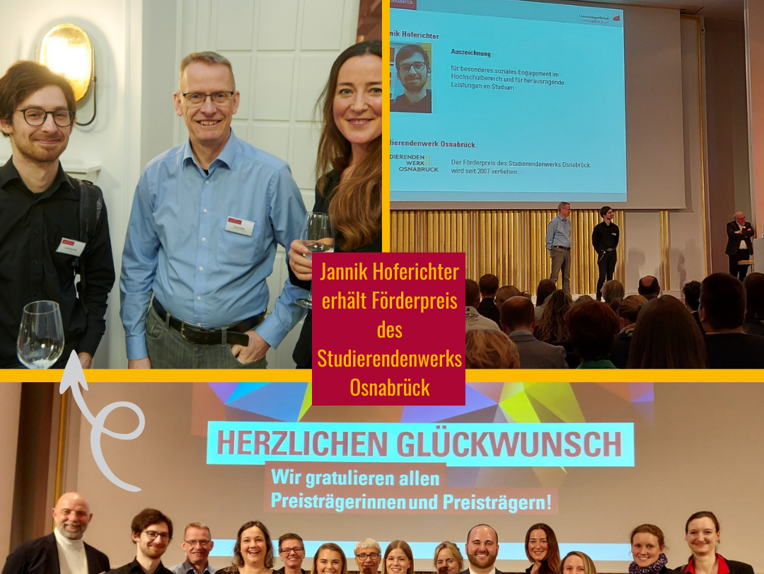 Jannik Hoferichter, Masterstudent des Lehramts an berufsbildenden Schulen und wissenschaftlicher Mitarbeiter in der Abteilung Pflegewissenschaft, hat den Förderpreis für besonderes soziales Engagement im Hochschulbereich und für herausragende Leistungen im Studium erhalten.